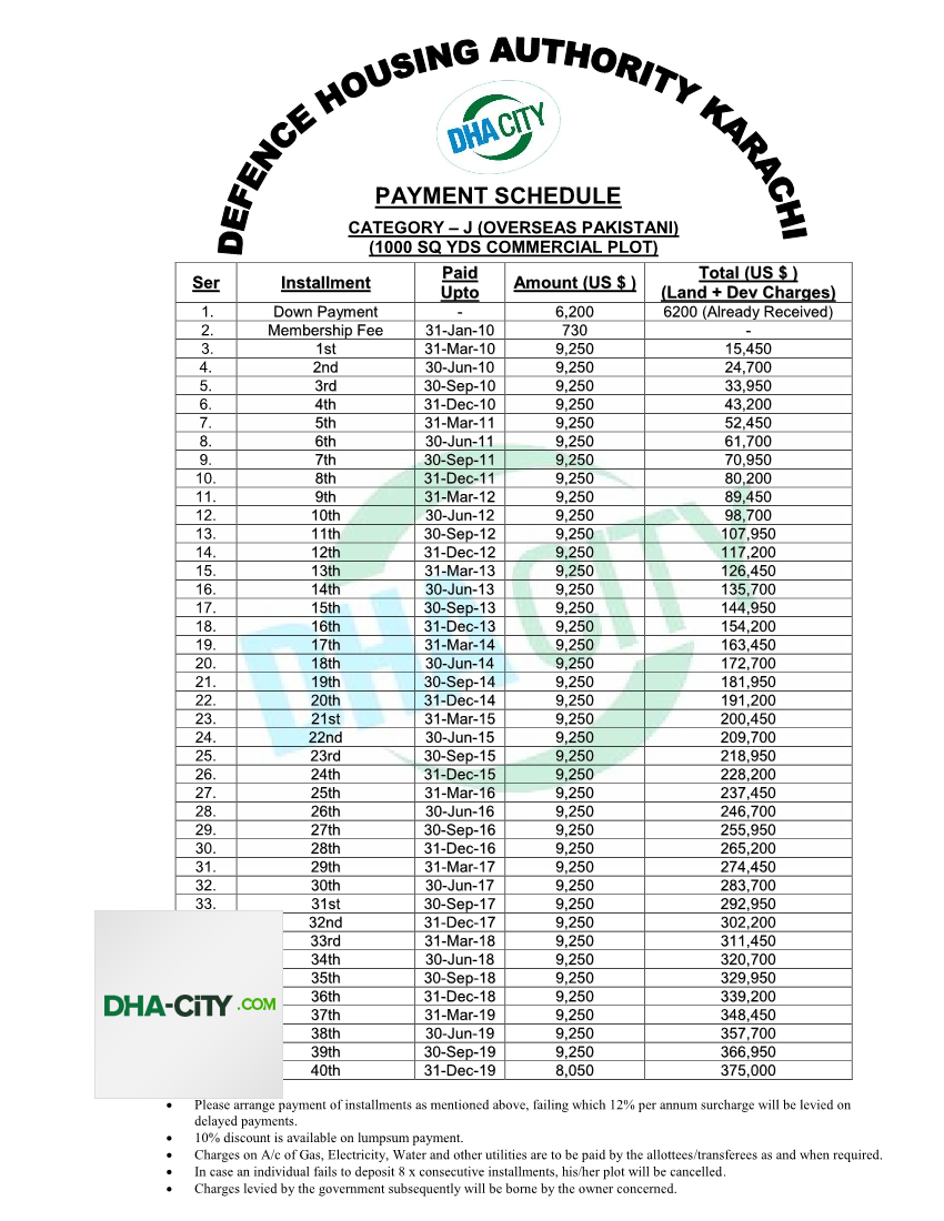 Home Payment Schedules 1000 sq yards commercial plot (Category J Overseas) in DHA City Karachi (DCK)