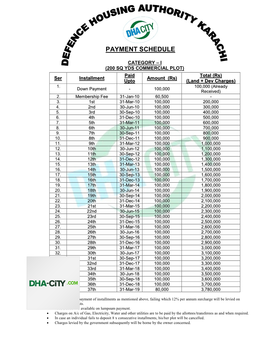 Home Payment Schedules 200 sq yards commercial plot (Category I) in DHA City Karachi (DCK)